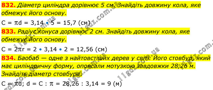 832. Діаметр циліндра дорівнює 5 см. Знайдіть довжину кола, яке обмежує його основу. С = d = 3,14 • 5 = 15,7 (см) 833. Радіус конуса дорівнює 2 см. Знайдіть довжину кола, яке обмежує його основу. С = 2r = 2 • 3,14 • 2 = 12,56 (см) 834. Баобаб — одне з найтовстіших дерев у світі. Його стовбур, який має циліндричну форму, опоясали мотузкою завдовжки 28,26 м. Знайдіть діаметр стовбура. С = d; d = C : = 28,26 : 3,14 = 9 (м)