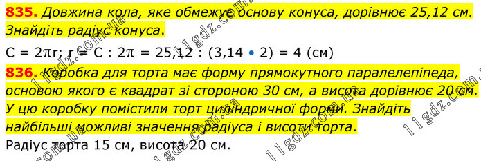 835. Довжина кола, яке обмежує основу конуса, дорівнює 25,12 см. Знайдіть радіус конуса. С = 2r; r = С : 2 = 25,12 : (3,14 • 2) = 4 (см) 836. Коробка для торта має форму прямокутного паралелепіпеда, основою якого є квадрат зі стороною 30 см, а висота дорівнює 20 см. У цю коробку помістили торт циліндричної форми. Знайдіть найбільші можливі значення радіуса і висоти торта. Радіус торта 15 см, висота 20 см.
