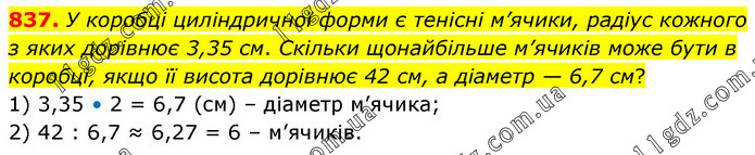 У коробці циліндричної форми є тенісні м’ячики, радіус кожного з яких дорівнює 3,35 см. Скільки щонайбільше м’ячиків може бути в коробці, якщо її висота дорівнює 42 см, а діаметр — 6,7 см? 1) 3,35 • 2 = 6,7 (см) – діаметр м’ячика; 2) 42 : 6,7 ≈ 6,27 = 6 – м’ячиків.
