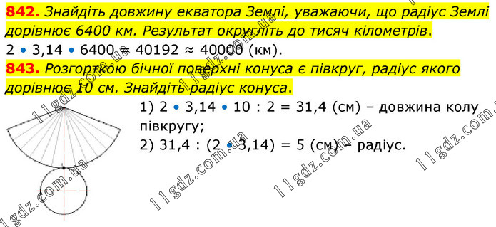 842. Знайдіть довжину екватора Землі, уважаючи, що радіус Землі дорівнює 6400 км. Результат округліть до тисяч кілометрів. 2 • 3,14 • 6400 = 40192 ≈ 40000 (км). 843. Розгорткою бічної поверхні конуса є півкруг, радіус якого дорівнює 10 см. Знайдіть радіус конуса. 1) 2 • 3,14 • 10 : 2 = 31,4 (см) – довжина колу півкругу; 2) 31,4 : (2 • 3,14) = 5 (см) – радіус.