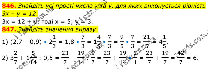 846. Знайдіть усі прості числа х та у, для яких виконується рівність 3х – у = 12. 3х = 12 + у; тоді х = 5; у = 3. 847. Знайдіть значення виразу: 1) (2,7 – 0,9) • 21/3 = 1,8 • 7/3 = 14/5 • 7/3 = 9/5 • 7/3 = 21/5 = 41/5. 2) 32/7 + 15/14 : 0,5 = 23/7 + 19/14 : 1/2 = 23/7 + 19/14 • 2/1 = 23/7 + 19/7 = 42/7 = 6.