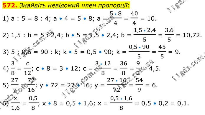 Знайдіть невідомий член пропорції: 1) а : 5 = 8 : 4; a • 4 = 5 • 8; a = (5 • 8)/4 = 40/4 = 10. 2) 1,5 : b = 5 : 2,4; b • 5 = 1,5 • 2,4; b = (1,5 • 2,4)/5 = 3,6/5 = 10,72. 3) 5 : 0,5 = 90 : k; k • 5 = 0,5 • 90; k = (0,5 • 90)/5 = 45/5 = 9. 4) 3/8 = с/12; с • 8 = 3 • 12; с = (3 • 12)/8 = 36/8 = 9/2 = 4,5. 5) 27/у = 72/16; у • 72 = 27 • 16; у = (27 • 16)/72 = 54/9 = 6. 6) х/1,6 = 0,5/8; х • 8 = 0,5 • 1,6; х = (0,5 • 1,6)/8 = 0,5 • 0,2 = 0,1.