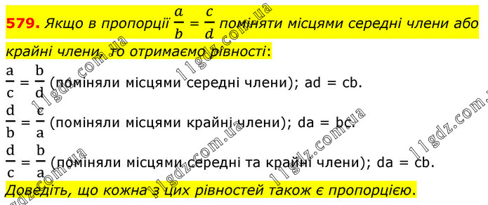 Якщо в пропорції a/b = c/d поміняти місцями середні члени або крайні члени, то отримаємо рівності: a/c = b/d (поміняли місцями середні члени); ad = cb. d/b = c/a (поміняли місцями крайні члени); da = bc. d/c = b/a (поміняли місцями середні та крайні члени); da = cb. Доведіть, що кожна з цих рівностей також є пропорцією.