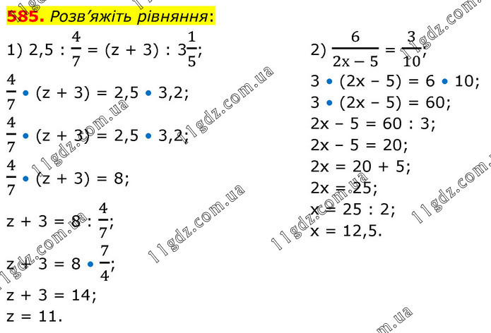 Розв’яжіть рівняння: 1) 2,5 : 4/7 = (z + 3) : 31/5; 4/7 • (z + 3) = 2,5 • 3,2; 4/7 • (z + 3) = 2,5 • 3,2; 4/7 • (z + 3) = 8; z + 3 = 8 : 4/7; z + 3 = 8 • 7/4; z + 3 = 14; z = 11. 2) 6/(2х - 5) = 3/10; 3 • (2х – 5) = 6 • 10; 3 • (2х – 5) = 60; 2х – 5 = 60 : 3; 2х – 5 = 20; 2х = 20 + 5; 2х = 25; х = 25 : 2; х = 12,5.