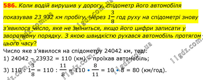 Коли водій вирушив у дорогу, спідометр його автомобіля показував 23 932 км пробігу. Через 13/8 год руху на спідометрі знову з’явилося число, яке не зміниться, якщо його цифри записати у зворотному порядку. З якою швидкістю рухався автомобіль протягом цього часу? Число яке з’явилося на спідометру 24042 км, тоді: 1) 24042 – 23932 = 110 (км) – проїхав автомобіль; 3) 110 : 13/8 = 110 : 11/8 = 110 • 8/11 = 10 • 8 = 80 (км/год).