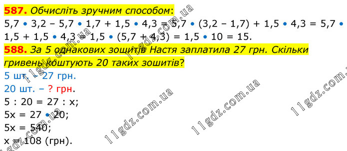 587. Обчисліть зручним способом: 5,7 • 3,2 – 5,7 • 1,7 + 1,5 • 4,3 = 5,7 • (3,2 – 1,7) + 1,5 • 4,3 = 5,7 • 1,5 + 1,5 • 4,3 = 1,5 • (5,7 + 4,3) = 1,5 • 10 = 15. 588. За 5 однакових зошитів Настя заплатила 27 грн. Скільки гривень коштують 20 таких зошитів? 5 шт. – 27 грн. 20 шт. – ? грн. 5 : 20 = 27 : х; 5х = 27 • 20; 5х = 540; х = 108 (грн).