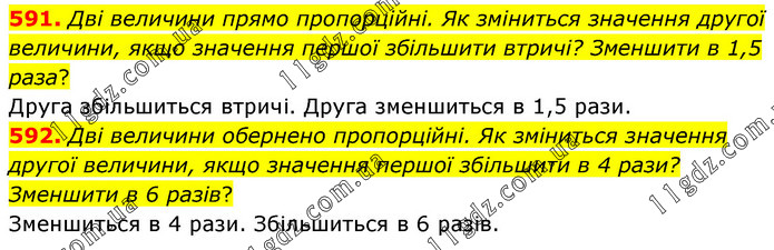 591. Дві величини прямо пропорційні. Як зміниться значення другої величини, якщо значення першої збільшити втричі? Зменшити в 1,5 раза? Друга збільшиться втричі. Друга зменшиться в 1,5 рази. 592. Дві величини обернено пропорційні. Як зміниться значення другої величини, якщо значення першої збільшити в 4 рази? Зменшити в 6 разів? Зменшиться в 4 рази. Збільшиться в 6 разів.