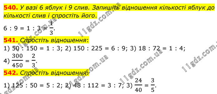 540. У вазі 6 яблук і 9 слив. Запишіть відношення кількості яблук до кількості слив і спростіть його. 6 : 9 = 1 : 3 = 1/3. 541. Спростіть відношення: 1) 50 : 150 = 1 : 3; 2) 150 : 225 = 6 : 9; 3) 18 : 72 = 1 : 4; 4) 300/450 = 2/3. 542. Спростіть відношення: 1) 125 : 50 = 5 : 2; 2) 48 : 112 = 3 : 7; 3) 24/40 = 3/5.