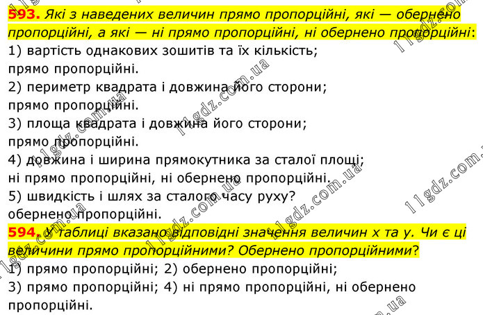 593. Які з наведених величин прямо пропорційні, які — обернено пропорційні, а які — ні прямо пропорційні, ні обернено пропорційні: 1) вартість однакових зошитів та їх кількість; прямо пропорційні. 2) периметр квадрата і довжина його сторони; прямо пропорційні. 3) площа квадрата і довжина його сторони; прямо пропорційні. 4) довжина і ширина прямокутника за сталої площі; ні прямо пропорційні, ні обернено пропорційні. 5) швидкість і шлях за сталого часу руху? обернено пропорційні. 594. У таблиці вказано відповідні значення величин х та у. Чи є ці величини прямо пропорційними? Обернено пропорційними? 1) прямо пропорційні; 2) обернено пропорційні; 3) прямо пропорційні; 4) ні прямо пропорційні, ні обернено пропорційні.