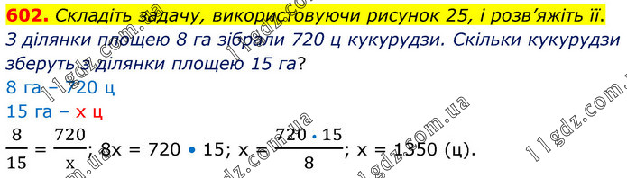 Складіть задачу, використовуючи рисунок 25, і розв’яжіть її. З ділянки площею 8 га зібрали 720 ц кукурудзи. Скільки кукурудзи зберуть з ділянки площею 15 га? 8 га – 720 ц 15 га – х ц 8/15 = 720/х; 8х = 720 • 15; х = (720 • 15)/8; х = 1350 (ц).