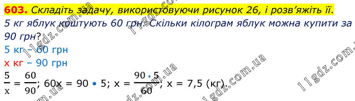 Складіть задачу, використовуючи рисунок 26, і розв’яжіть її. 5 кг яблук коштують 60 грн. Скільки кілограм яблук можна купити за 90 грн? 5 кг – 60 грн х кг – 90 грн 5/х = 60/90; 60х = 90 • 5; х = (90 • 5)/60; х = 7,5 (кг).