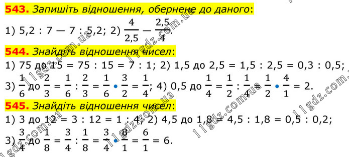 543. Запишіть відношення, обернене до даного: 1) 5,2 : 7 — 7 : 5,2; 2) 4/2,5 — 2,5/4. 544. Знайдіть відношення чисел: 1) 75 до 15 = 75 : 15 = 7 : 1; 2) 1,5 до 2,5 = 1,5 : 2,5 = 0,3 : 0,5; 3) 1/6 до 2/3 = 1/6 : 2/3 = 1/6 • 3/2 = 1/4; 4) 0,5 до 1/4 = 1/2 : 1/4 = 1/2 • 4/1 = 2. 545. Знайдіть відношення чисел: 1) 3 до 12 = 3 : 12 = 1 : 4; 2) 4,5 до 1,8 = 4,5 : 1,8 = 0,5 : 0,2; 3) 3/4 до 1/8 = 3/4 : 1/8 = 3/4 • 8/1 = 6/1 = 6.