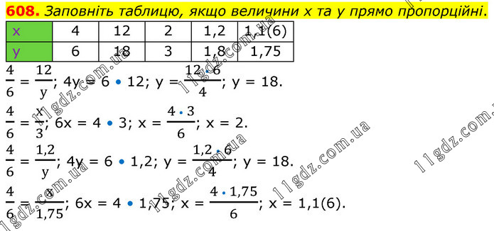 608. Заповніть таблицю, якщо величини х та у прямо пропорційні. 4/6 = 12/у; 4у = 6 • 12; у = (12 • 6)/4; у = 18. 4/6 = х/3; 6х = 4 • 3; х = (4 • 3)/6; х = 2. 4/6 = 1,2/у; 4у = 6 • 1,2; у = (1,2 • 6)/4; у = 18. 4/6 = х/1,75; 6х = 4 • 1,75; х = (4 • 1,75)/6; х = 1,1(6).