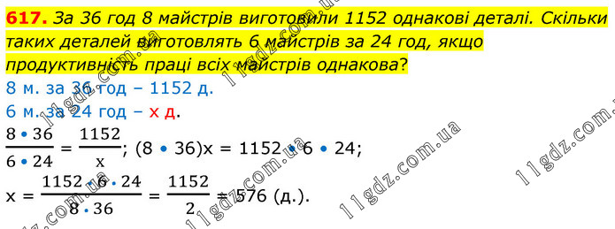 За 36 год 8 майстрів виготовили 1152 однакові деталі. Скільки таких деталей виготовлять 6 майстрів за 24 год, якщо продуктивність праці всіх майстрів однакова? 8 м. за 36 год – 1152 д. 6 м. за 24 год – х д. (8 • 36)/(6 • 24) = 1152/х; (8 • 36)х = 1152 • 6 • 24; х = (1152 • 6 • 24)/(8 • 36) = 1152/( 2) = 576 (д.).