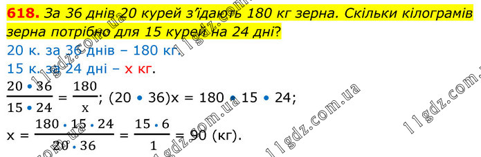За 36 днів 20 курей з’їдають 180 кг зерна. Скільки кілограмів зерна потрібно для 15 курей на 24 дні? 20 к. за 36 днів – 180 кг. 15 к. за 24 дні – х кг. (20 • 36)/(15 • 24) = 180/х; (20 • 36)х = 180 • 15 • 24; х = (180 • 15 • 24)/(20 • 36) = (15 • 6)/( 1) = 90 (кг).