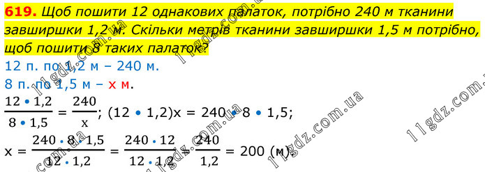 Щоб пошити 12 однакових палаток, потрібно 240 м тканини завширшки 1,2 м. Скільки метрів тканини завширшки 1,5 м потрібно, щоб пошити 8 таких палаток? 12 п. по 1,2 м – 240 м. 8 п. по 1,5 м – х м. (12 • 1,2)/(8 • 1,5) = 240/х; (12 • 1,2)х = 240 • 8 • 1,5; х = (240 • 8 • 1,5)/(12 • 1,2) = (240 • 12)/( 12 • 1,2) = 240/( 1,2) = 200 (м).