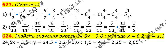 623. Обчисліть: 1) 41/2 • 22/3 – 63/4 = 9/2 • 8/3 – 27/4 = 12/1 – 63/4 = 114/4 – 63/4 = 51/4. 2) (8/33 – 1/11) : 10/11 = (8/33 – 3/33) : 10/11 = 5/33 : 10/11 = 5/33 • 11/10 = 1/6. 624. Знайдіть значення виразу 24,5х – 3,6 : у, якщо х = 0,2; у = 1,6 24,5х – 3,6 : у = 24,5 • 0,2 – 3,6 : 1,6 = 4,9 – 2,25 = 2,65.