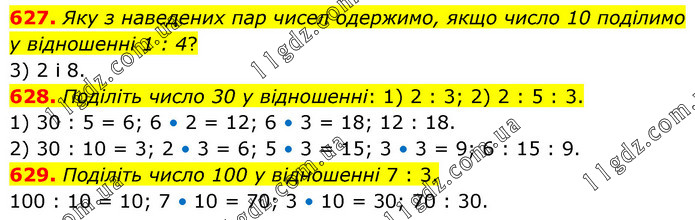 627. Яку з наведених пар чисел одержимо, якщо число 10 поділимо у відношенні 1 : 4? 3) 2 і 8. 628. Поділіть число 30 у відношенні: 1) 2 : 3; 2) 2 : 5 : 3. 1) 30 : 5 = 6; 6 • 2 = 12; 6 • 3 = 18; 12 : 18. 2) 30 : 10 = 3; 2 • 3 = 6; 5 • 3 = 15; 3 • 3 = 9; 6 : 15 : 9. 629. Поділіть число 100 у відношенні 7 : 3. 100 : 10 = 10; 7 • 10 = 70; 3 • 10 = 30; 70 : 30.