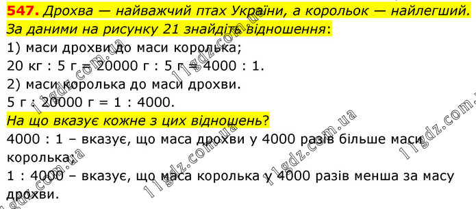 547. Дрохва — найважчий птах України, а корольок — найлегший. За даними на рисунку 21 знайдіть відношення: 1) маси дрохви до маси королька; 20 кг : 5 г = 20000 г : 5 г = 4000 : 1. 2) маси королька до маси дрохви. 5 г : 20000 г = 1 : 4000. На що вказує кожне з цих відношень? 4000 : 1 – вказує, що маса дрохви у 4000 разів більше маси королька; 1 : 4000 – вказує, що маса королька у 4000 разів менша за масу дрохви.