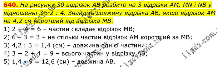 На рисунку 30 відрізок АВ розбито на 3 відрізки АМ, МN і NB у відношенні 3 : 2 : 4. Знайдіть довжину відрізка АВ, якщо відрізок АМ на 4,2 см коротший від відрізка МВ. 1) 2 + 4 = 6 – частин складає відрізок МВ; 2) 6 – 3 = 3 – на стільки частин відрізок АМ коротший за МВ; 3) 4,2 : 3 = 1,4 (см) – довжина однієї частини; 4) 3 + 2 + 4 = 9 – всього частин у відрізку АВ; 5) 1,4 • 9 = 12,6 (см) – довжина АВ.