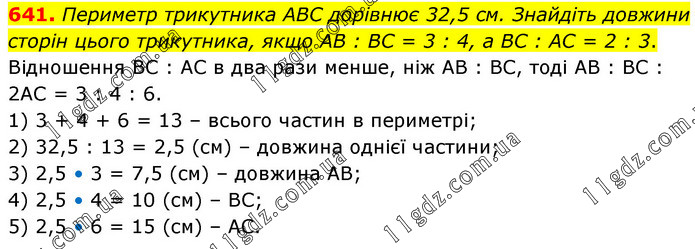Периметр трикутника АВС дорівнює 32,5 см. Знайдіть довжини сторін цього трикутника, якщо АВ : ВС = 3 : 4, а ВС : АС = 2 : 3. Відношення ВС : АС в два рази менше, ніж АВ : ВС, тоді АВ : ВС : 2АС = 3 : 4 : 6. 1) 3 + 4 + 6 = 13 – всього частин в периметрі; 2) 32,5 : 13 = 2,5 (см) – довжина однієї частини; 3) 2,5 • 3 = 7,5 (см) – довжина АВ; 4) 2,5 • 4 = 10 (см) – ВС; 5) 2,5 • 6 = 15 (см) – АС.