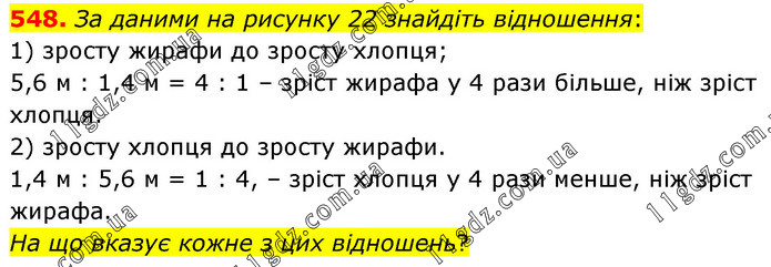 За даними на рисунку 22 знайдіть відношення: 1) зросту жирафи до зросту хлопця; 5,6 м : 1,4 м = 4 : 1 – зріст жирафа у 4 рази більше, ніж зріст хлопця. 2) зросту хлопця до зросту жирафи. 1,4 м : 5,6 м = 1 : 4, – зріст хлопця у 4 рази менше, ніж зріст жирафа. На що вказує кожне з цих відношень?
