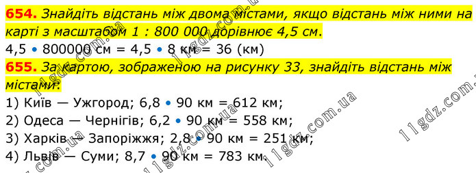 654. Знайдіть відстань між двома містами, якщо відстань між ними на карті з масштабом 1 : 800 000 дорівнює 4,5 см. 4,5 • 800000 см = 4,5 • 8 км = 36 (км) 655. За картою, зображеною на рисунку 33, знайдіть відстань між містами: 1) Київ — Ужгород; 6,8 • 90 км = 612 км; 2) Одеса — Чернігів; 6,2 • 90 км = 558 км; 3) Харків — Запоріжжя; 2,8 • 90 км = 251 км; 4) Львів — Суми; 8,7 • 90 км = 783 км.