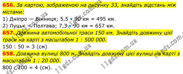 656. За картою, зображеною на рисунку 33, знайдіть відстань між містами: 1) Дніпро — Вінниця; 5,5 • 90 км = 495 км. 2) Луцьк — Полтава; 7,3 • 90 км = 657 км. 657. Довжина автомобільної траси 150 км. Знайдіть довжину цієї траси на карті з масштабом 1 : 500 000. 150 : 50 = 3 (см) 658. Довжина вулиці 800 м. Знайдіть довжину цієї вулиці на карті з масштабом 1 : 20 000. 800 : 200 = 4 (см).