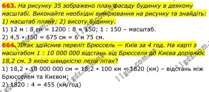 663. На рисунку 35 зображено план фасаду будинку в деякому масштабі. Виконайте необхідні вимірювання на рисунку та знайдіть: 1) масштаб плану; 2) висоту будинку. 1) 12 м : 8 см = 1200 : 8 = 150; 1 : 150 – масштаб. 2) 4,5 • 150 = 675 см = 6 м 75 см. 664. Літак здійснив переліт Брюссель — Київ за 4 год. На карті з масштабом 1 : 10 000 000 відстань від Брюсселя до Києва дорівнює 18,2 см. З якою швидкістю летів літак? 1) 18,2 • 10 000 000 см = 18,2 • 100 км = 1820 (км) – відстань між Брюсселем та Києвом; 2) 1820 : 4 = 455 (км/год)