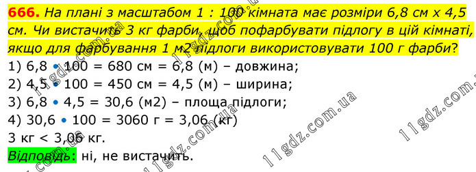 На плані з масштабом 1 : 100 кімната має розміри 6,8 см х 4,5 см. Чи вистачить 3 кг фарби, щоб пофарбувати підлогу в цій кімнаті, якщо для фарбування 1 м2 підлоги використовувати 100 г фарби? 1) 6,8 • 100 = 680 см = 6,8 (м) – довжина; 2) 4,5 • 100 = 450 см = 4,5 (м) – ширина; 3) 6,8 • 4,5 = 30,6 (м2) – площа підлоги; 4) 30,6 • 100 = 3060 г = 3,06 (кг) 3 кг < 3,06 кг. Відповідь: ні, не вистачить.