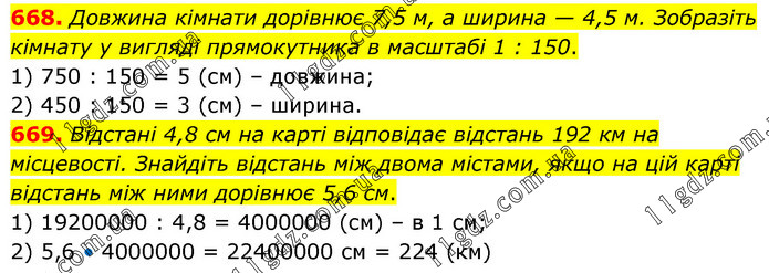 668. Довжина кімнати дорівнює 7,5 м, а ширина — 4,5 м. Зобразіть кімнату у вигляді прямокутника в масштабі 1 : 150. 1) 750 : 150 = 5 (см) – довжина; 2) 450 : 150 = 3 (см) – ширина. 669. Відстані 4,8 см на карті відповідає відстань 192 км на місцевості. Знайдіть відстань між двома містами, якщо на цій карті відстань між ними дорівнює 5,6 см. 1) 19200000 : 4,8 = 4000000 (см) – в 1 см; 2) 5,6 • 4000000 = 22400000 см = 224 (км)