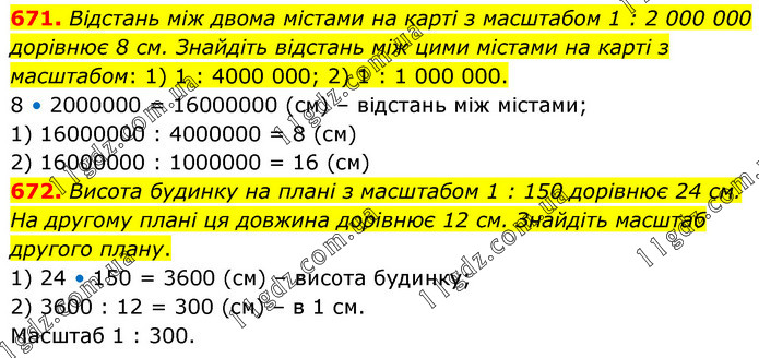 671. Відстань між двома містами на карті з масштабом 1 : 2 000 000 дорівнює 8 см. Знайдіть відстань між цими містами на карті з масштабом: 1) 1 : 4000 000; 2) 1 : 1 000 000. 8 • 2000000 = 16000000 (см) – відстань між містами; 1) 16000000 : 4000000 = 8 (см) 2) 16000000 : 1000000 = 16 (см) 672. Висота будинку на плані з масштабом 1 : 150 дорівнює 24 см. На другому плані ця довжина дорівнює 12 см. Знайдіть масштаб другого плану. 1) 24 • 150 = 3600 (см) – висота будинку; 2) 3600 : 12 = 300 (см) – в 1 см. Масштаб 1 : 300.