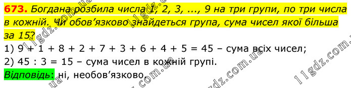 Богдана розбила числа 1, 2, 3, ..., 9 на три групи, по три числа в кожній. Чи обов’язково знайдеться група, сума чисел якої більша за 15? 1) 9 + 1 + 8 + 2 + 7 + 3 + 6 + 4 + 5 = 45 – сума всіх чисел; 2) 45 : 3 = 15 – сума чисел в кожній групі. Відповідь: ні, необов’язково.