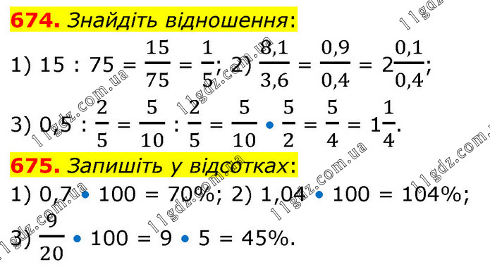 674. Знайдіть відношення: 1) 15 : 75 = 15/75 = 1/5; 2) 8,1/3,6 = 0,9/0,4 = 20,1/0,4; 3) 0,5 : 2/5 = 5/10 : 2/5 = 5/10 • 5/2 = 5/4 = 11/4. 675. Запишіть у відсотках: 1) 0,7 • 100 = 70%; 2) 1,04 • 100 = 104%; 3) 9/20 • 100 = 9 • 5 = 45%.