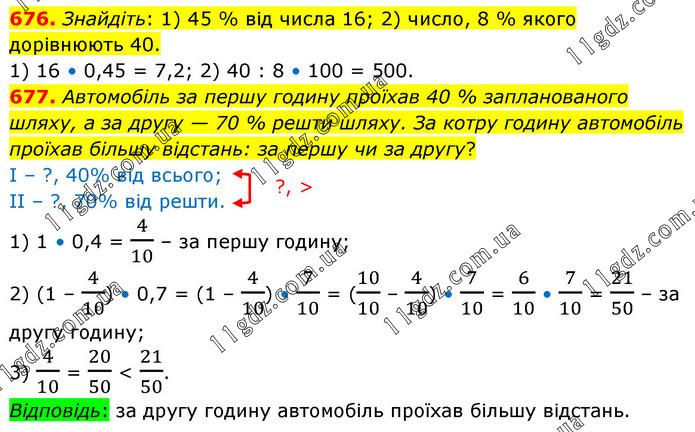 676. Знайдіть: 1) 45 % від числа 16; 2) число, 8 % якого дорівнюють 40. 1) 16 • 0,45 = 7,2; 2) 40 : 8 • 100 = 500. 677. Автомобіль за першу годину проїхав 40 % запланованого шляху, а за другу — 70 % решти шляху. За котру годину автомобіль проїхав більшу відстань: за першу чи за другу? І – ?, 40% від всього; ІІ – ?, 70% від решти. 1) 1 • 0,4 = 4/10 – за першу годину; 2) (1 – 4/10) • 0,7 = (1 – 4/10) • 7/10 = (10/10 – 4/10) • 7/10 = 6/10 • 7/10 = 21/50 – за другу годину; 3) 4/10 = 20/50 < 21/50. Відповідь: за другу годину автомобіль проїхав більшу відстань.