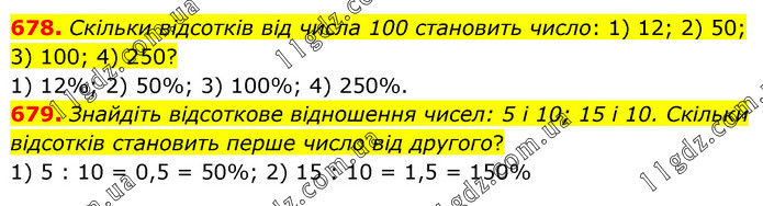 678. Скільки відсотків від числа 100 становить число: 1) 12; 2) 50; 3) 100; 4) 250? 1) 12%; 2) 50%; 3) 100%; 4) 250%. 679. Знайдіть відсоткове відношення чисел: 5 і 10; 15 і 10. Скільки відсотків становить перше число від другого? 1) 5 : 10 = 0,5 = 50%; 2) 15 : 10 = 1,5 = 150%