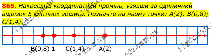 Накресліть координатний промінь, узявши за одиничний відрізок 5 клітинок зошита. Позначте на ньому точки: А(2); В(0,8); С(1,4).