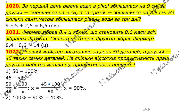 1020. За перший день рівень води в річці збільшився на 9 см, за другий — зменшився на 5 см, а за третій — збільшився на 2,5 см. На скільки сантиметрів збільшився рівень води за три дні? 9 – 5 + 2,5 = 6,5 (см) 1021. Фермер зібрав 8,4 ц яблук, що становить 0,6 маси всіх зібраних фруктів. Скільки центнерів фруктів зібрав фермер? 8,4 : 0,6 = 14 (ц). 1022. Перший майстер виготовляє за день 50 деталей, а другий — 45 таких самих деталей. На скільки відсотків продуктивність праці другого майстра менша від продуктивності першого? 1) 50 – 100% 45 – х% 50/45 = 100/х; х = (45 • 100)/50; х = 90%. 2) 100% – 90% = 10%.