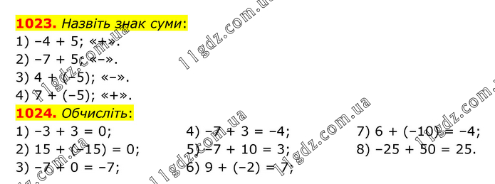 1023. Назвіть знак суми: 1) –4 + 5; «+». 2) –7 + 5; «–». 3) 4 + (–5); «–». 4) 7 + (–5); «+». 1024. Обчисліть: 1) –3 + 3 = 0; 2) 15 + (–15) = 0; 3) –7 + 0 = –7; 4) –7 + 3 = –4; 5) –7 + 10 = 3; 6) 9 + (–2) = 7; 7) 6 + (–10) = –4; 8) –25 + 50 = 25.