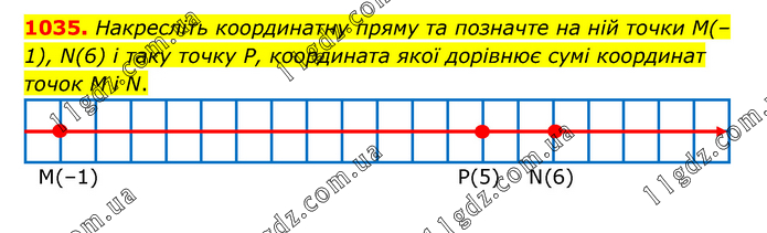Накресліть координатну пряму та позначте на ній точки М(–1), N(6) і таку точку Р, координата якої дорівнює сумі координат точок M i N.