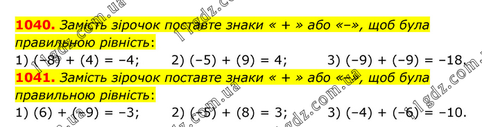 1040. Замість зірочок поставте знаки « + » або «–», щоб була правильною рівність: 1) (–8) + (4) = –4; 2) (–5) + (9) = 4; 3) (–9) + (–9) = –18. 1041. Замість зірочок поставте знаки « + » або «–», щоб була правильною рівність: 1) (6) + (–9) = –3; 2) (–5) + (8) = 3; 3) (–4) + (–6) = –10.
