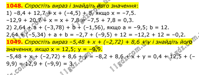 1048. Спростіть вираз і знайдіть його значення: 1) –8,4 + 12,7 + х + (–4,5) + 8, якщо х = –7,5. –12,9 + 20,7 + х = х + 7,8 = –7,5 + 7,8 = 0,3. 2) 2,64 + а + (–3,78) + b + (–1,56), якщо а = –9,5; b = 12. 2,64 + (–5,34) + a + b = –2,7 + (–9,5) + 12 = –12,2 + 12 = –0,2. 1049. Спростіть вираз –5,48 + х + (–2,72) + 8,6 + у і знайдіть його значення, якщо х = 12,5; у = –9,9. –5,48 + х + (–2,72) + 8,6 + у = –8,2 + 8,6 + х + у = 0,4 + 12,5 + (–9,9) = 12,9 + (–9,9) = 3.