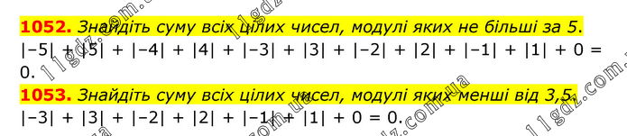 1052. Знайдіть суму всіх цілих чисел, модулі яких не більші за 5. |–5| + |5| + |–4| + |4| + |–3| + |3| + |–2| + |2| + |–1| + |1| + 0 = 0. 1053. Знайдіть суму всіх цілих чисел, модулі яких менші від 3,5. |–3| + |3| + |–2| + |2| + |–1| + |1| + 0 = 0.