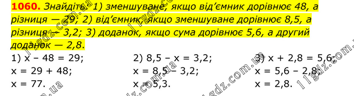 Знайдіть: 1) зменшуване, якщо від’ємник дорівнює 48, а різниця — 29; 2) від’ємник, якщо зменшуване дорівнює 8,5, а різниця — 3,2; 3) доданок, якщо сума дорівнює 5,6, а другий доданок — 2,8. 1) х – 48 = 29; х = 29 + 48; х = 77. 2) 8,5 – х = 3,2; х = 8,5 – 3,2; х = 5,3. 3) х + 2,8 = 5,6; х = 5,6 – 2,8; х = 2,8.