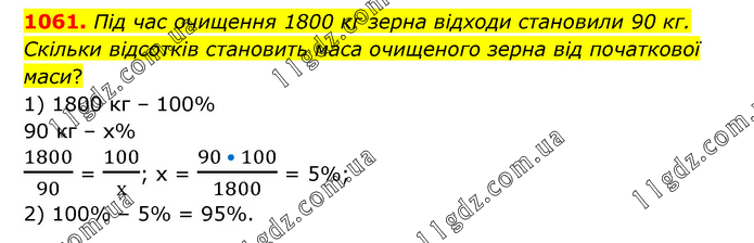 Під час очищення 1800 кг зерна відходи становили 90 кг. Скільки відсотків становить маса очищеного зерна від початкової маси? 1) 1800 кг – 100% 90 кг – х% 1800/90 = 100/х; х = (90 • 100)/1800 = 5%; 2) 100% – 5% = 95%.