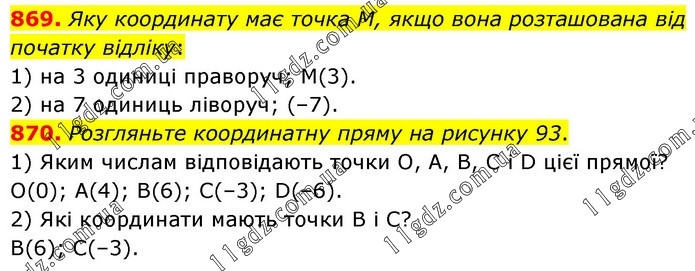 869. Яку координату має точка М, якщо вона розташована від початку відліку: 1) на 3 одиниці праворуч; М(3). 2) на 7 одиниць ліворуч; (–7). 870. Розгляньте координатну пряму на рисунку 93. 1) Яким числам відповідають точки О, А, В, C і D цієї прямої? О(0); А(4); В(6); С(–3); D(–6). 2) Які координати мають точки В і С? В(6); С(–3).