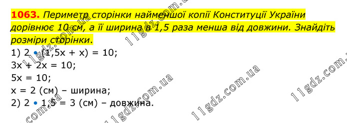 Периметр сторінки найменшої копії Конституції України дорівнює 10 см, а її ширина в 1,5 раза менша від довжини. Знайдіть розміри сторінки. 1) 2 • (1,5х + х) = 10; 3х + 2х = 10; 5х = 10; х = 2 (см) – ширина; 2) 2 • 1,5 = 3 (см) – довжина.