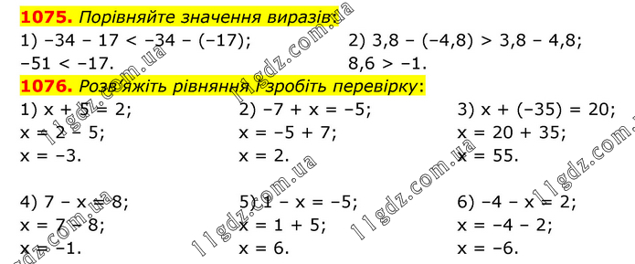 1075. Порівняйте значення виразів: 1) –34 – 17 < –34 – (–17); –51 < –17. 2) 3,8 – (–4,8) > 3,8 – 4,8; 8,6 > –1. 1076. Розв’яжіть рівняння і зробіть перевірку: 1) х + 5 = 2; х = 2 – 5; х = –3. 2) –7 + х = –5; х = –5 + 7; х = 2. 3) х + (–35) = 20; х = 20 + 35; х = 55. 4) 7 – х = 8; х = 7 – 8; х = –1. 5) 1 – х = –5; х = 1 + 5; х = 6. 6) –4 – х = 2; х = –4 – 2; х = –6.
