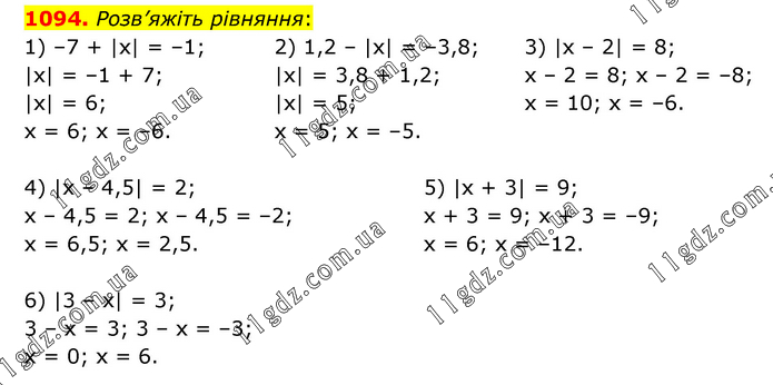 Розв’яжіть рівняння: 1) –7 + |x| = –1; |x| = –1 + 7; |x| = 6; x = 6; x = –6. 2) 1,2 – |x| = –3,8; |x| = 3,8 + 1,2; |x| = 5; x = 5; x = –5. 3) |x – 2| = 8; x – 2 = 8; x – 2 = –8; x = 10; x = –6. 4) |x – 4,5| = 2; x – 4,5 = 2; x – 4,5 = –2; x = 6,5; x = 2,5. 5) |х + 3| = 9; x + 3 = 9; x + 3 = –9; x = 6; x = –12. 6) |3 – х| = 3; 3 – x = 3; 3 – x = –3; x = 0; x = 6.