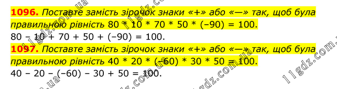1096. Поставте замість зірочок знаки «+» або «—» так, щоб була правильною рівність 80 * 10 * 70 * 50 * (–90) = 100. 80 – 10 + 70 + 50 + (–90) = 100. 1097. Поставте замість зірочок знаки «+» або «—» так, щоб була правильною рівність 40 * 20 * (–60) * 30 * 50 = 100. 40 – 20 – (–60) – 30 + 50 = 100.